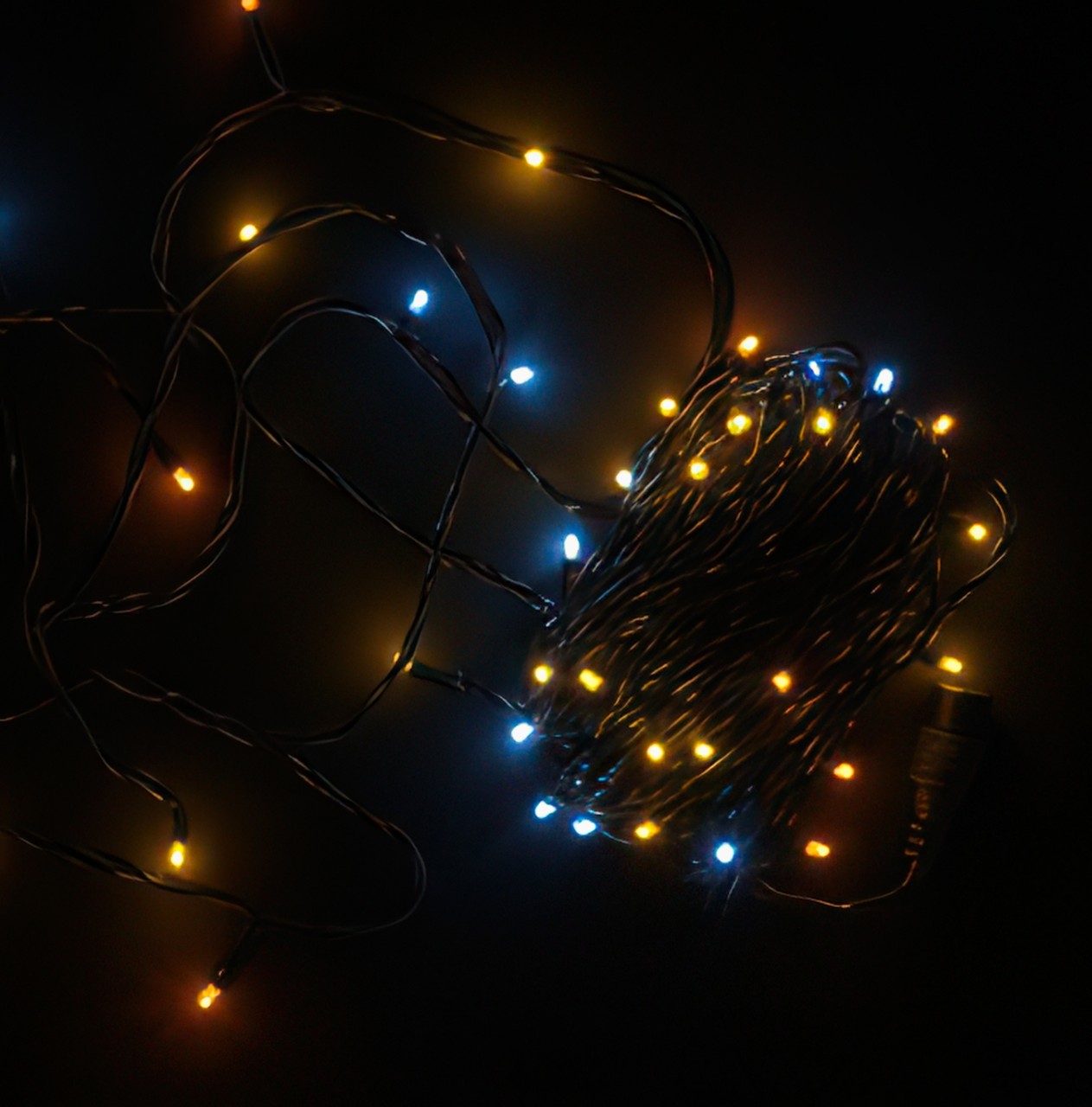 Cordão 100 leds duas cores com estrobinhos sendo 80 fixos e 20 estrobos, estrobos na cor branco frio, com fiação de cobre, diâmetro de 2,2 mm, comprimento de 9,5m mais 0,50 de tomada, distância dos leds 10cm de um led para outro, leds de 05cm, sistema de conexão com tomada macho e fêmea para união de até 05 conjuntos, uso externo, IP44, resistente a chuva, com resina na base dos leds, totalmente a prova d’água, 220V, potência 5W, com fonte retificadora IP65.