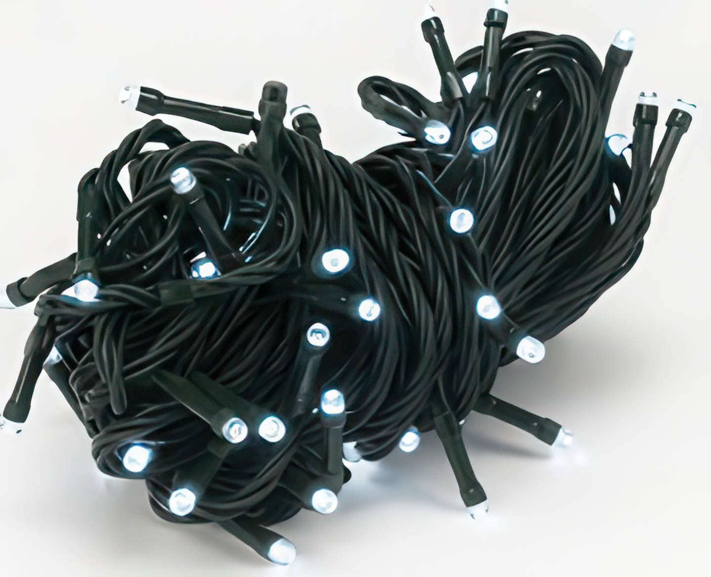 Cordão 100 LEDs sendo 80 fixos e 20 estrobos, com fio verde ou fio cristal (na cor do LED), fiação de cobre, diâmetro de 2,2 mm, comprimento de 9,5mts mais 0,50m de tomada, distância de 10cm de um LED para outro, LEDs de 05cm, sistema de conexão com tomada macho e fêmea para união de até 05 conjuntos, uso externo, IP44, resistente à chuva, com resina na base dos LEDs, totalmente à prova d’água, 220V, potência 5W, com fonte retificadora IP65.