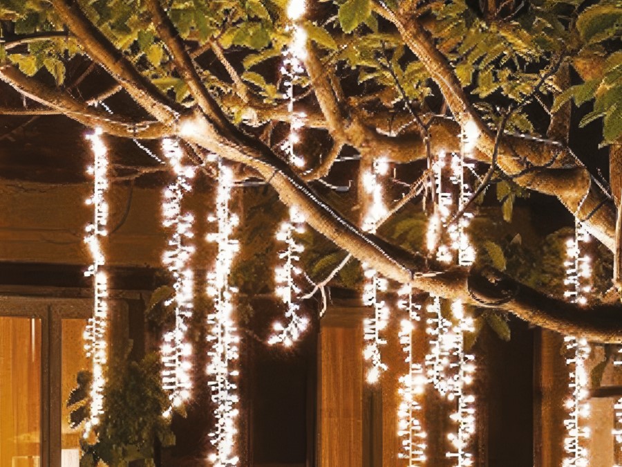 Cordão led festão branco frio com 160 leds, com efeito único de snowfall, com fio verde, fiação de cobre, diâmetro 1,8mm, comprimento total 1,20m, com fonte retificadora, bivolt, IP44, uso externo.