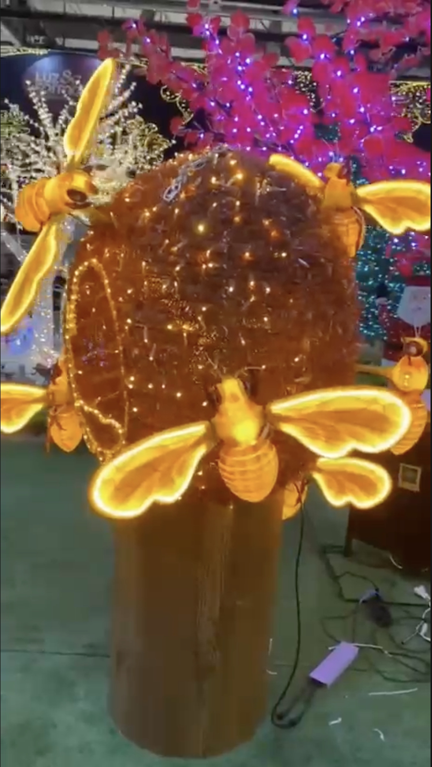 Elemento decorativo em formato de colmeia com iluminação LED, ideal para composições temáticas e cenários lúdicos. Dimensões aproximadas: 0,80 x 1,00 metro. Estrutura confeccionada em material rígido com acabamento texturizado que simula uma colmeia natural. A parte externa é contornada por cordão LED na cor branco quente, proporcionando iluminação suave e contínua. A abertura frontal é realçada com mangueira de LED branco quente, reforçando o destaque visual do orifício. A peça acompanha duas abelhas decorativas com asas translúcidas e movimento nas asas, criando um efeito visual dinâmico quando iluminadas. A iluminação das abelhas gera uma tonalidade amarelada com efeito pulsante, reforçando o aspecto lúdico do conjunto. Alimentação em 12V, garantindo segurança elétrica e economia de energia. Grau de proteção IP65.
