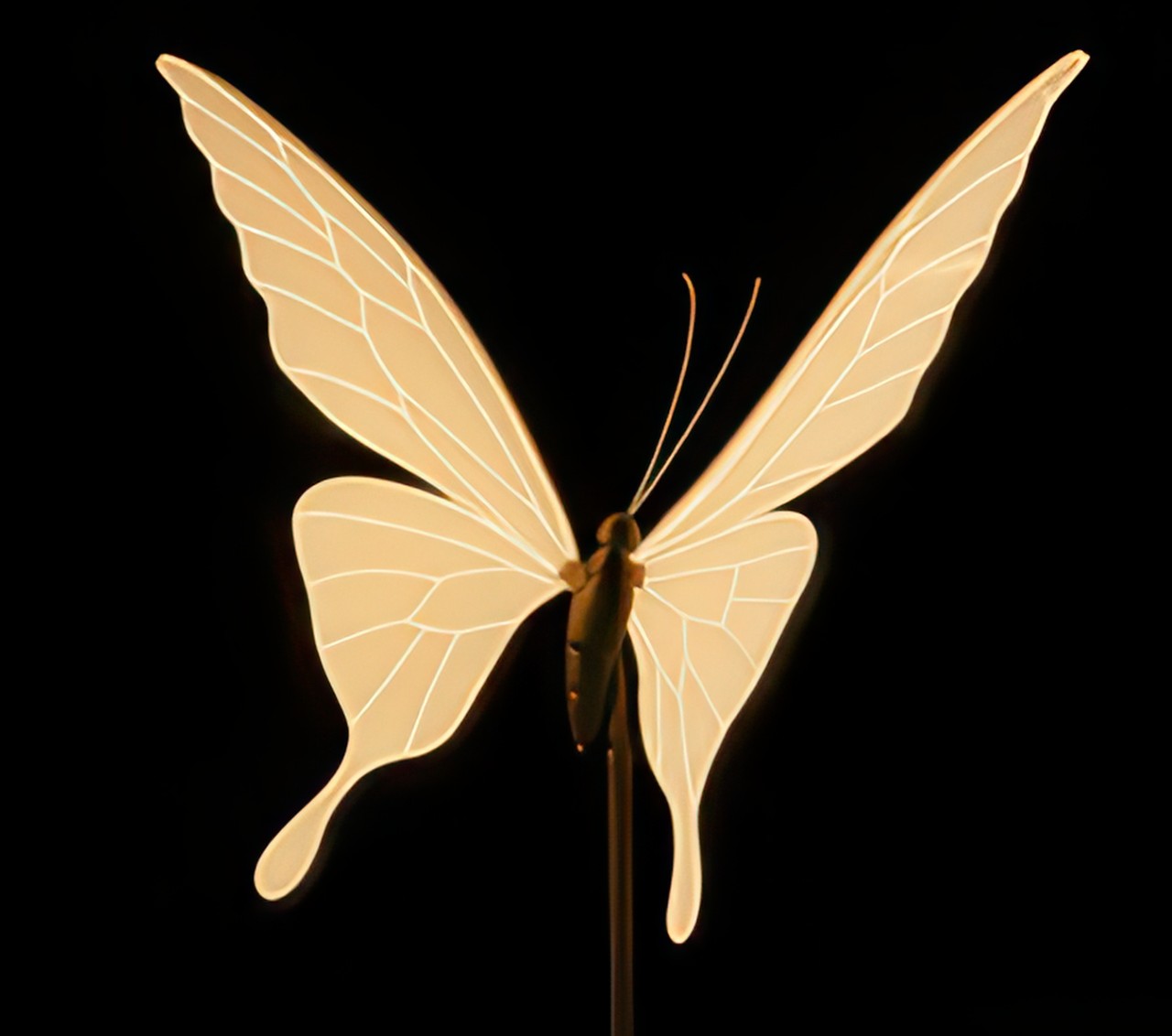 Elemento decorativo em formato de borboleta com iluminação LED nas cores branco quente ou branco frio, ideal para composições natalinas em praças, fachadas e jardins. Possui movimento nas asas, criando um efeito visual encantador e dinâmico.Produto resistente para uso externo, com grau de proteção IP44 e alimentação em 24V. Estrutura plástica com base metálica para fixação no solo.