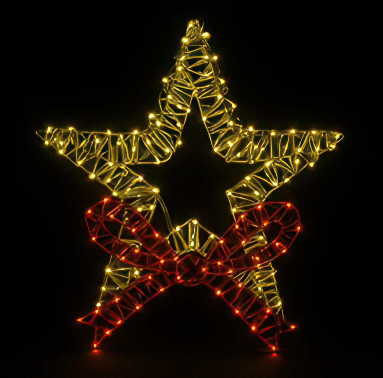 Elemento decorativo em formato de estrela de 5 pontas, com estrutura metálica revestida com material refletivo. Iluminação composta por 80 LEDs fixos nas cores branco quente e vermelho, distribuídos na estrela e no laço decorativo acoplado à peça. Fio transparente, acabamento detalhado. Grau de proteção IP44, uso externo, bivolt, diâmetro de 50cm.