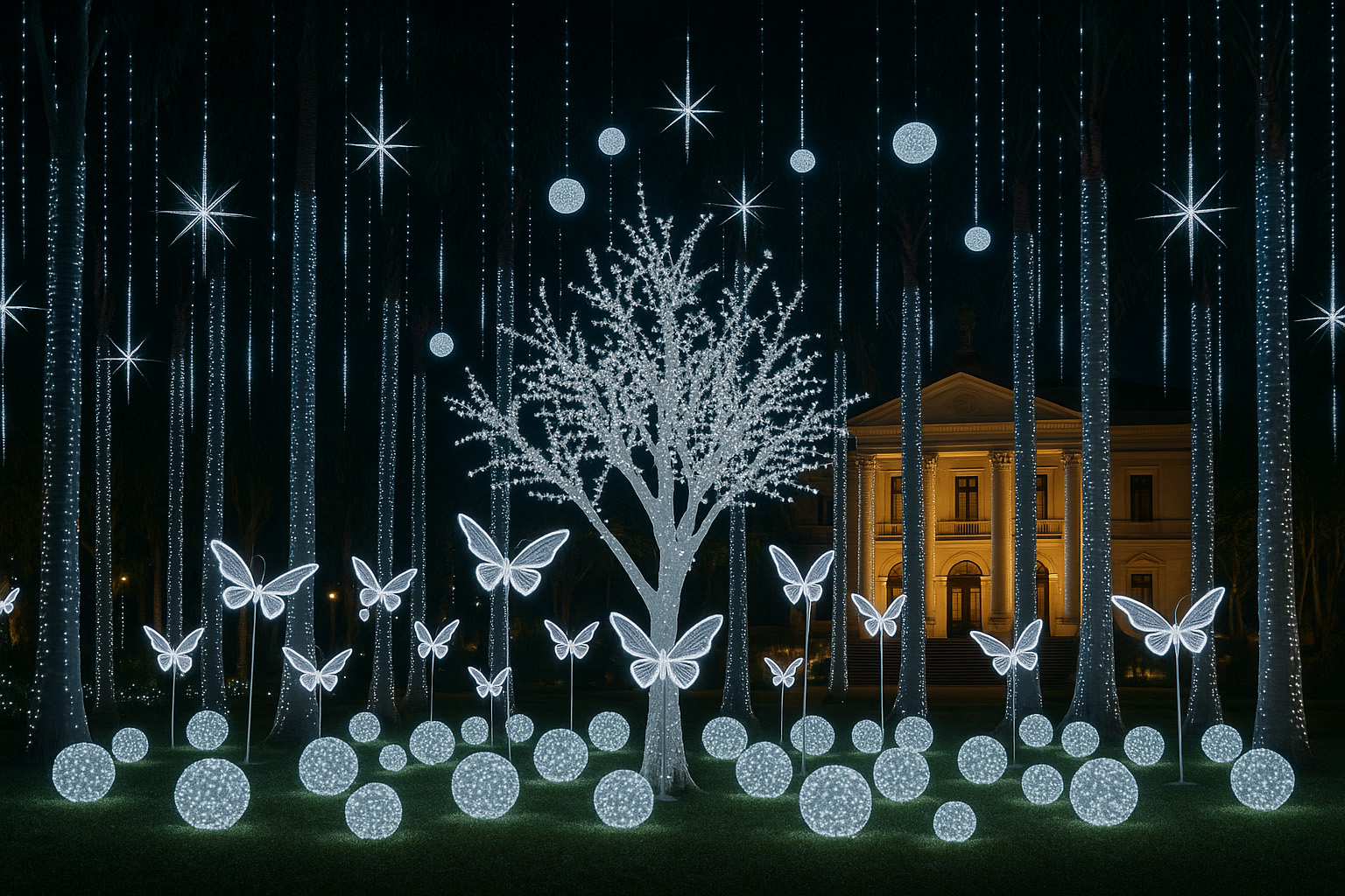 336 cordões LED 120 com estrobo (IP44) – 24 cascatas LED estrobo (10m) – 1 árvore cerejeira de 3 metros (IP65) – 16 estrelas Sputnik (160 LEDs, IP44) – 8 borboletas LED âmbar 40cm com base (IP44) – 5 borboletas LED âmbar 60cm com base (IP44) – 3 borboletas LED âmbar 100cm com base (IP44) – 60 bolas LED 50cm (IP44)