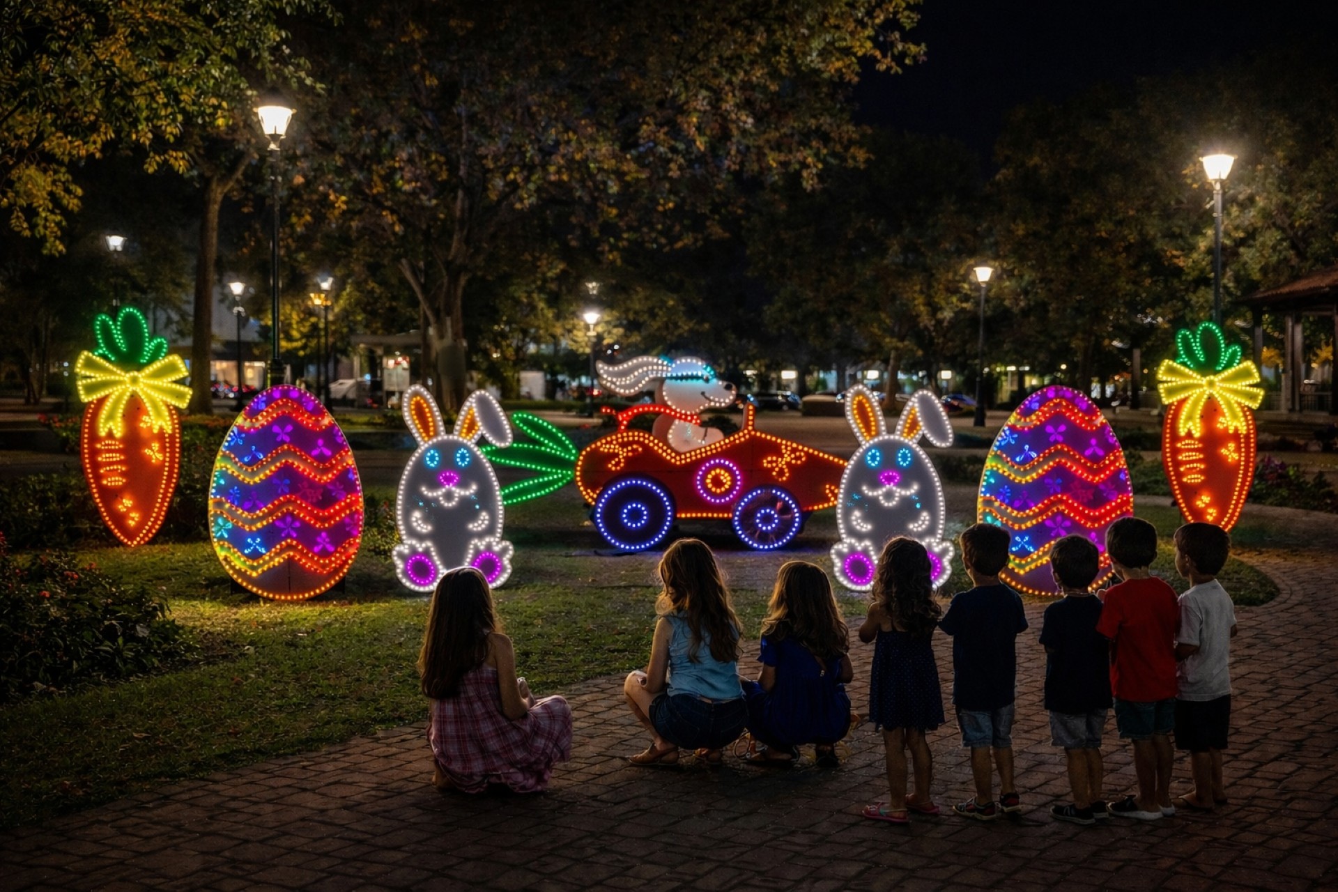 Espaços públicos (praças, jardins, canteiros e rotatórias), escolas, supermercados, lojas, clínicas e espaços que buscam uma decoração de Páscoa com alto impacto visual e grande destaque noturno.