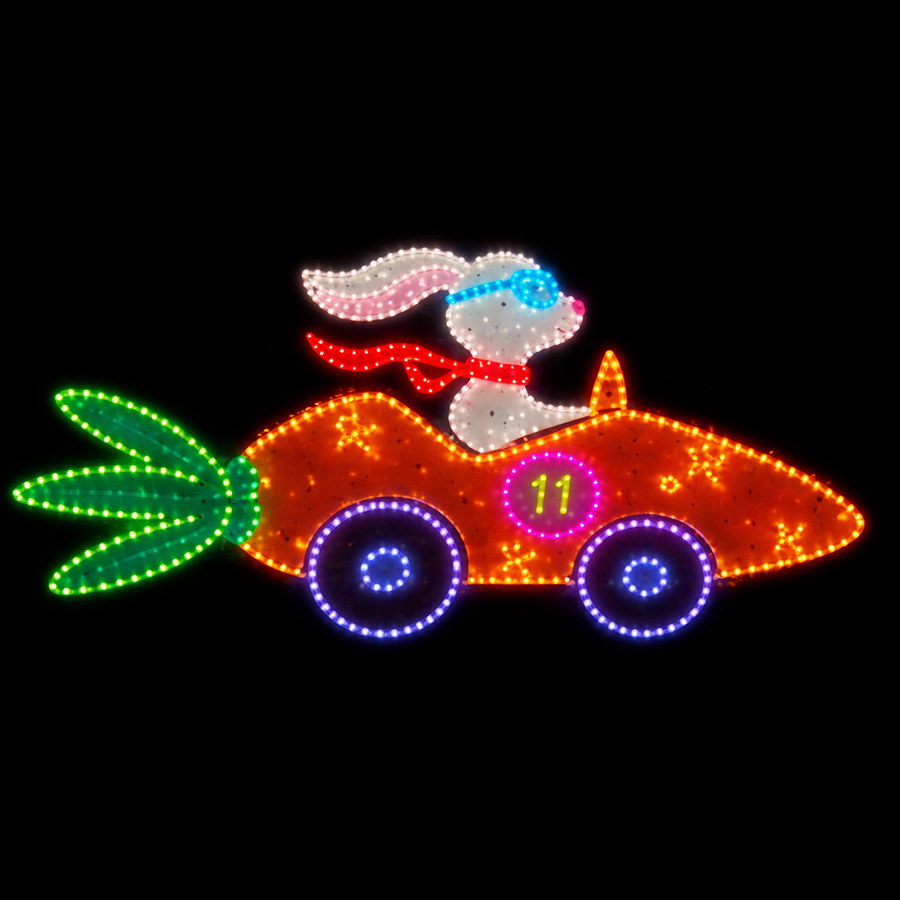 Elemento decorativo temático em formato de coelho condutor, representado dirigindo um veículo estilizado em formato de cenoura, destinado à ambientação externa em praças, parques e espaços públicos, com alto apelo visual e caráter instagramável. A cenoura possui acabamento cromático predominante na cor laranja, com detalhes em tons de verde, enquanto o coelho apresenta acabamento em tons claros, com lenço decorativo aplicado na região do pescoço, e óculos decorativos, conforme concepção estética do elemento decorativo. A peça possui altura de 1,10 m, largura de 2,21 m e com espessura estrutural de 13,6 cm sendo confeccionada em material plástico técnico de alta resistência para uso externo (exposição solar, chuva, intempéries e variações climáticas), com espessura estrutural de 8 mm, estrutura interna metálica e pés estruturais para fixação ao solo, garantindo estabilidade e segurança em ambiente externo. A iluminação é composta por Pixel LED digital RGBW, aplicada em iluminação 3D, operando em baixa tensão (5V), com pixels de grau de proteção IP68 e sistema eletrônico acondicionado em caixa hermética IP65 (integrada ao produto). O funcionamento é automático, com efeitos luminosos programados. Alimentação elétrica em 220V.