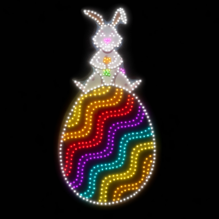 Elemento decorativo temático em formato de coelho, representado sentado sobre um ovo decorativo, destinado à ambientação externa em praças, parques e espaços públicos, com forte apelo visual e caráter instagramável. O coelho apresenta acabamento cromático predominante em tons claros, com detalhes em rosa nas orelhas e focinho, segurando cenoura decorativa em tons de laranja e verde, conforme concepção estética do elemento decorativo. O ovo decorativo possui acabamento predominante em tonalidade marrom, com faixas sinuosas multicoloridas em amarelo, rosa, azul e laranja, distribuídas de forma harmônica ao longo da superfície. A peça possui altura de 2,17 m, comprimento de 1,07 m e com espessura estrutural de 13,6 cm sendo confeccionada em material plástico técnico de alta resistência para uso externo (exposição solar, chuva, intempéries e variações climáticas), com espessura estrutural de 8 mm, estrutura interna metálica e pés estruturais para fixação ao solo, garantindo estabilidade e segurança em ambiente externo. A iluminação é composta por Pixel LED digital RGBW, aplicada em iluminação 3D, operando em baixa tensão (5V), com pixels de grau de proteção IP68 e sistema eletrônico acondicionado em caixa hermética IP65 (integrada ao produto). O funcionamento é automático, com efeitos luminosos programados. Alimentação elétrica em 220V.