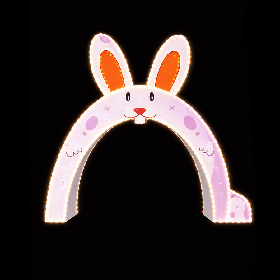 Elemento decorativo temático em formato de pórtico, com desenho estilizado de coelho, destinado à ambientação externa em praças, parques, acessos principais e espaços instagramáveis, permitindo a circulação de pessoas sob a estrutura, com elevado impacto visual e apelo cenográfico. A peça possui altura de 4,32 m e largura de 3,67 m, sendo confeccionada em material plástico técnico de alta resistência para uso externo (exposição solar, chuva, intempéries e variações climáticas), com espessura estrutural de 26,6 mm, associada a estrutura portante metálica interna e pés estruturais para fixação ao solo, garantindo elevada rigidez, estabilidade mecânica, segurança ao público e resistência às intempéries. O pórtico apresenta acabamento cromático predominante em tons claros, com detalhes internos nas orelhas em tom laranja e elementos faciais iluminados, conforme concepção estética do elemento decorativo, assegurando leitura visual adequada tanto no período diurno quanto noturno. A iluminação é composta por Pixel LED digital RGBW, aplicada em iluminação cênica, operando em baixa tensão (5V), com pixels de grau de proteção IP68 e sistema eletrônico acondicionado em caixa hermética IP65. O funcionamento é automático, com efeitos luminosos programados. Alimentação elétrica em 220V.