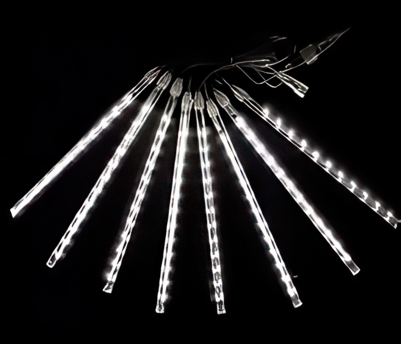 Conjunto com 08 tubos de led com 50cm de cada tubo, efeito neve caindo, com comprimento total de 2,5 metros, com 30 leds em cada lado, totalizando 60 leds em cada tubo, com cabo de ligação de 50cm, IP44, bivolt, potência miníma 03w.